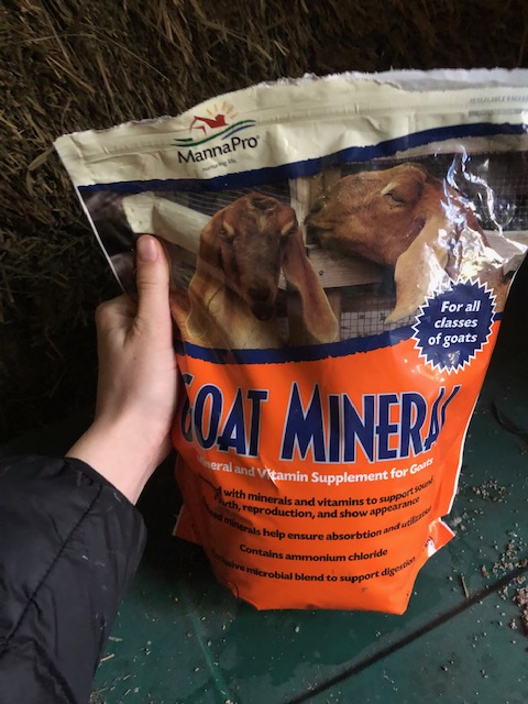 Goat need some supplements. All you really need to offer is minerals, which can be feed free choice or with certain amounts daily. I would suggest using loose minerals, since they are easier for goats to eat than if they try to lick the mineral blocks. I don’t know much about mineral balances, but the best brands I’ve heard are Sweetlix® Meat Maker® and manna pro goat minerals ®. I feed manna pro because this is what is stocked at our local feed store. A lot of people also feed free-choice baking soda to help goats self-regulate their bloat, but I’ve found my goats never touched it and eventually I just took it out.